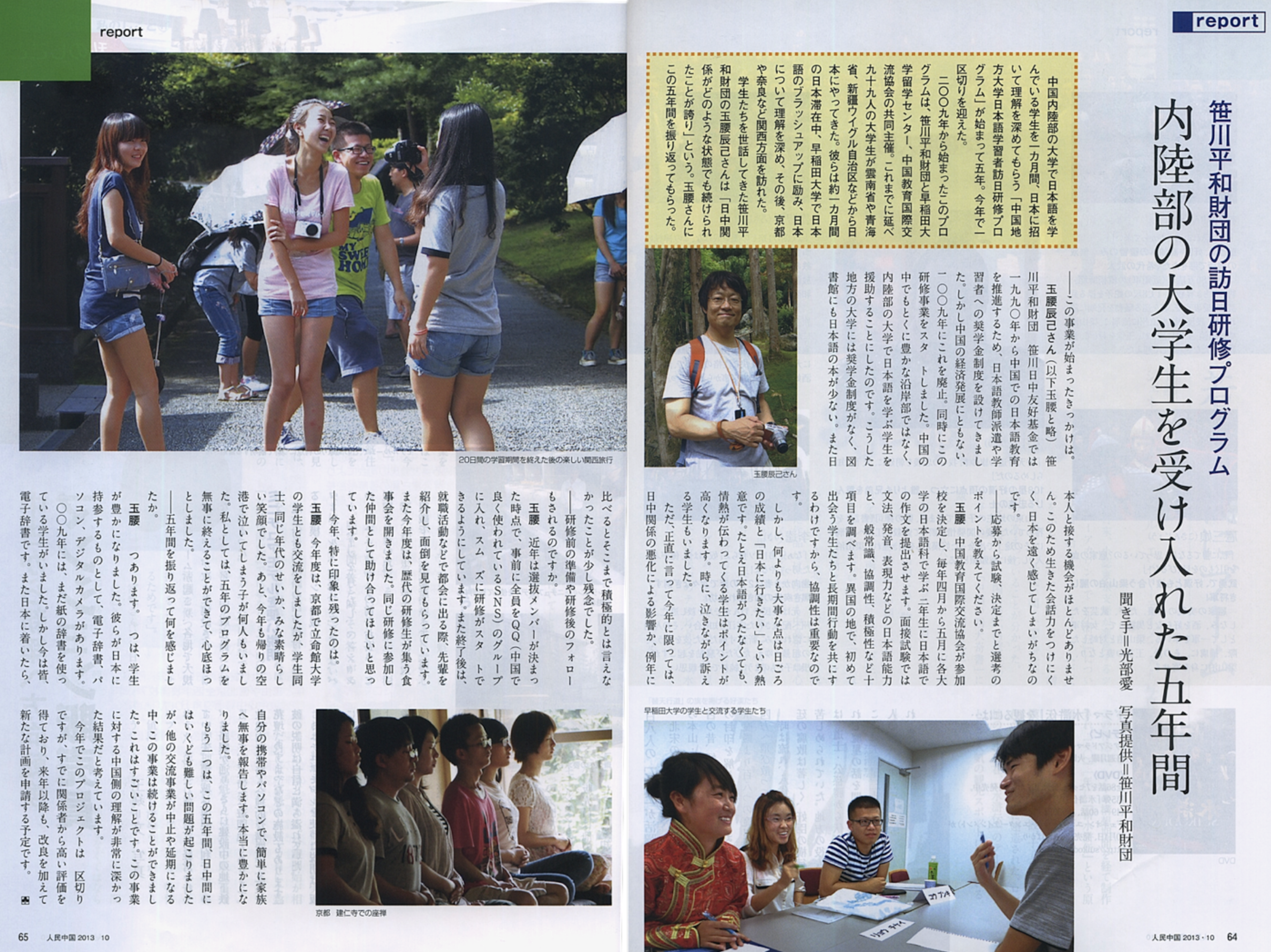 ![]() | 【インタビュー】 「笹川平和財団の訪日研修プログラム 内陸部の大学生を受け入れた五年間」、『人民中国』2013年10月号、64-65頁 ![]() |