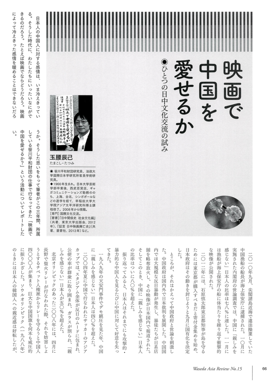 ![]() | 【寄稿】 「映画で中国を愛せるか」、早稲田大学アジア研究機構『ワセダ アジアレビュー 2014 No.15 』めこん、2014年2月、66-71頁 |