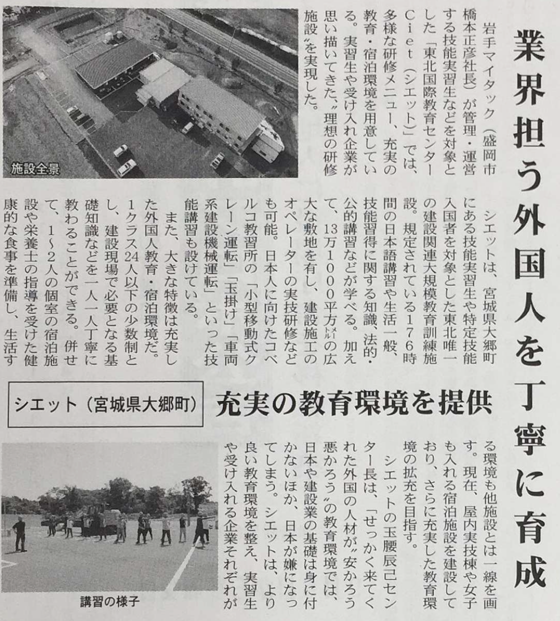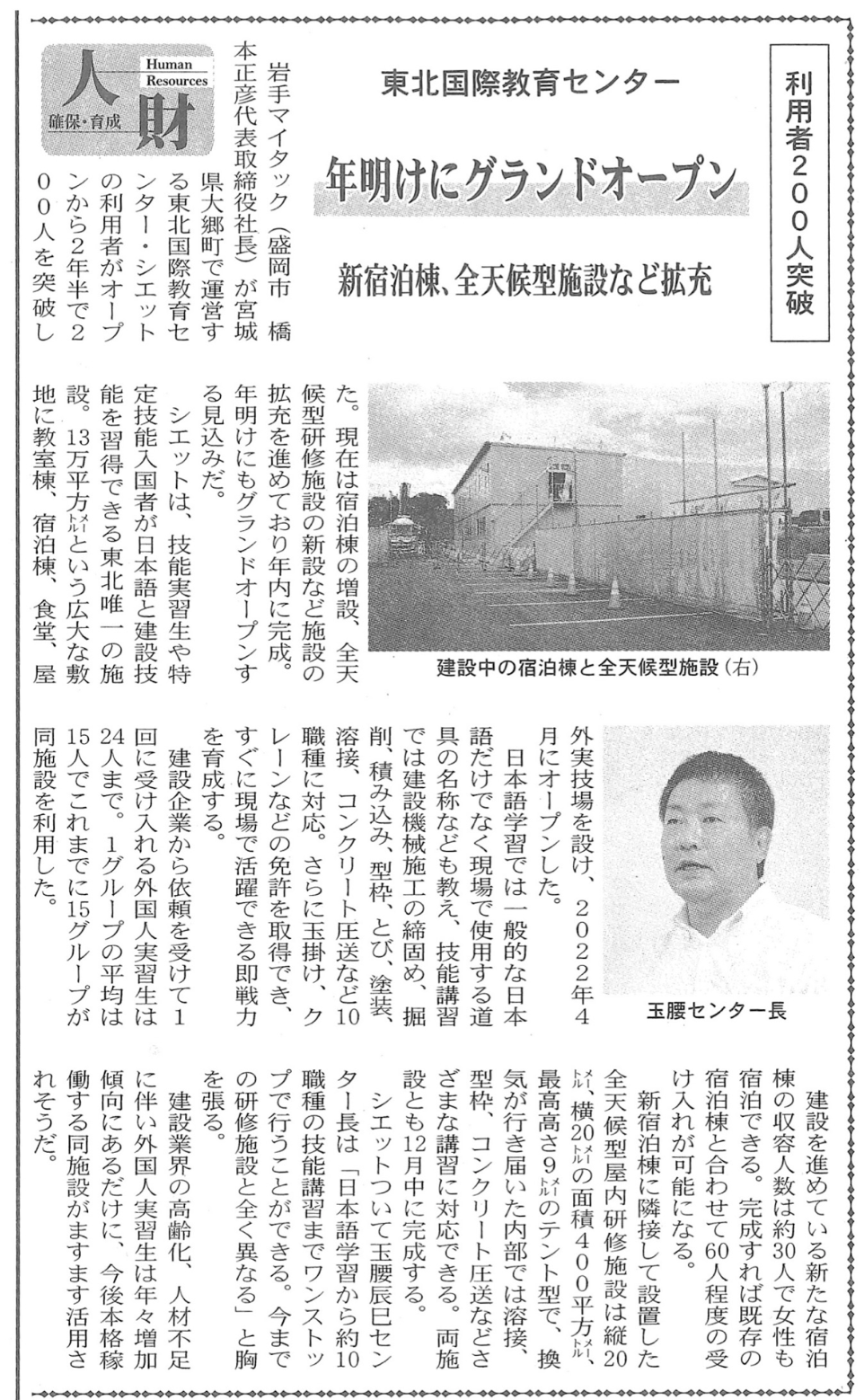 ![]() | 【新聞記事】 建設新聞 東北国際教育センター 年明けにグランドオープン 2024年9月20日 |